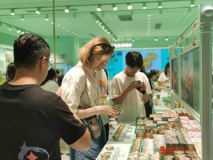 正大广场华为旗舰店内,一名境外游客正在挑选商品。同在正大广场、位于三楼的“青稚”门店,店里也有几位境外游客正在购物,一打听,他们来自德国。青稚经营的是文创护手霜,产品设计颇具小心思:圆形的护手霜盒上,印有陆家嘴“四件套”的图案,顾客还可以按照自己出生的月、日,找到对应的数字,挑选专属的“生日护手霜”。