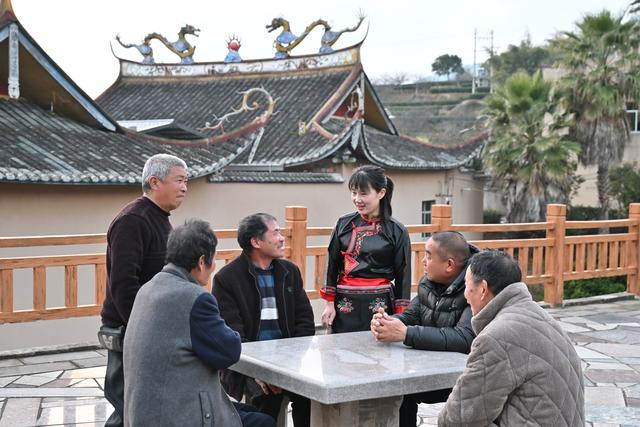 2025年2月27日,福建省福安市康厝畲族乡金斗洋村党支部书记、村委会主任钟团玉(右三)在畲族武术主题公园内与老人们交流。钟团玉带领金斗洋村村民依托当地悠久的畲族武术传统和浓厚的畲族文化底蕴,探索出一条畲族文化与乡村振兴有机结合的发展之路。新华社记者 姜克红 摄