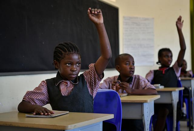 2024年11月4日,在位于博茨瓦纳奎嫩区的莫帕尼小学,8岁的普拉丹斯·茜比(左)在上课。位于博茨瓦纳南部奎嫩区的莫帕尼小学是中国援建的一所现代化学校,于2021年移交博方并开始招生。该校目前有大约800余名学生,凭借着良好的设施和优异的教学成绩,得到家长和学生的普遍好评。新华社记者 韩旭 摄