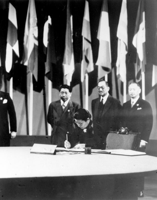 1945年6月26日,参加《联合国宪章》制宪会议的50个国家的代表,在旧金山举行历时8个小时的签字仪式。图为中国代表团成员吴贻芳在宪章上签字。新华社发