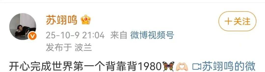 当晚,中国单板滑雪运动员苏翊鸣在社交平台晒出滑雪视频,并配文:开心完成世界第一个背靠背1980。