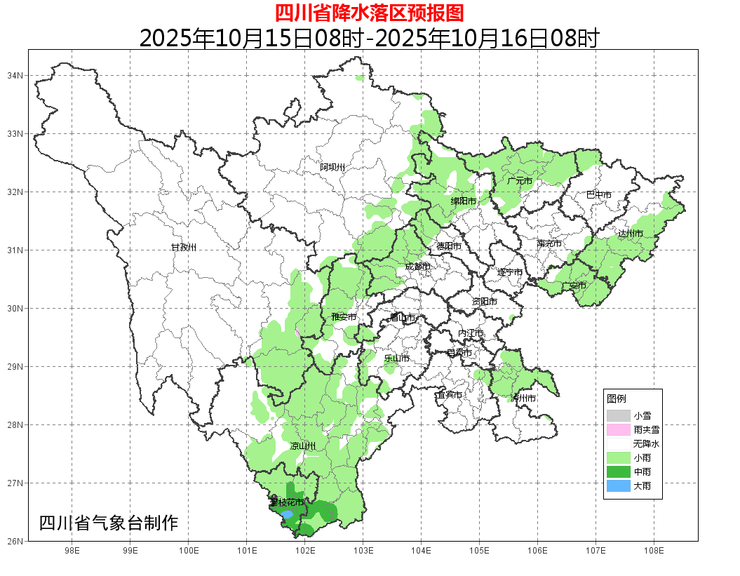 15日白天到晚上:盆地多云间阴,盆周地区有阵雨或雷雨;甘孜州东部、阿坝州东部和攀西地区大部阴天间多云有阵雨或雷雨,局部有中到大雨,川西高原其余地方多云间晴。