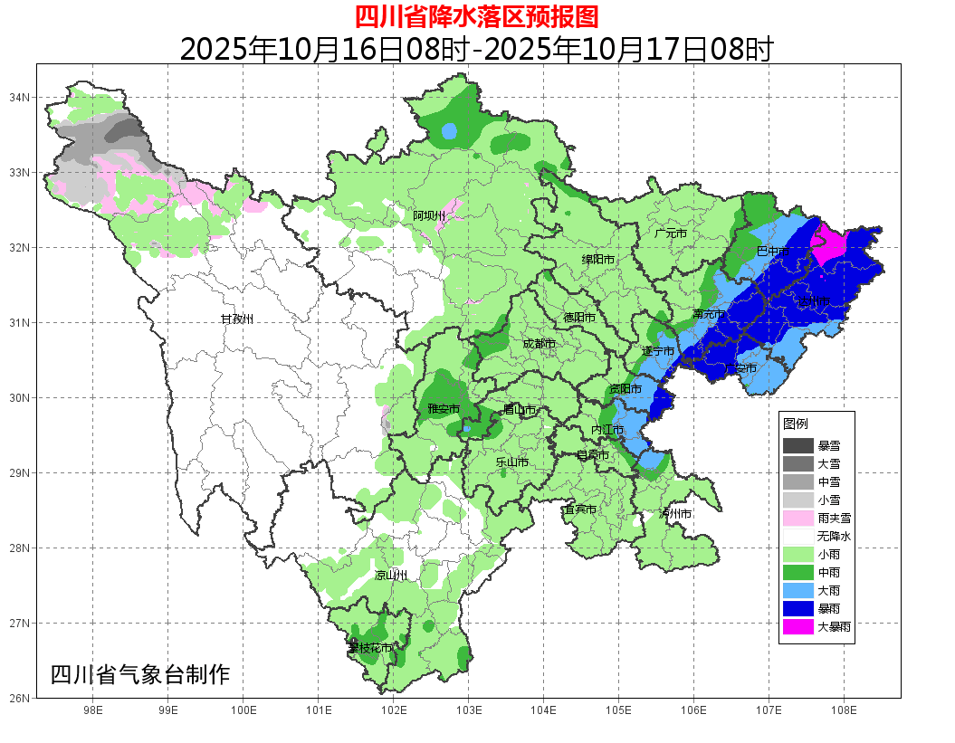 16日白天到晚上:盆地阴天间多云有阵雨或雷雨,其中达州、巴中、广安3市和南充、遂宁、资阳、内江4市东部有大雨到暴雨,局地大暴雨;甘孜州西北部东部、阿坝州和攀西地区大部阴天间多云有阵雨(雪)或雷雨,局部中到大雨(雪),川西高原其余地方多云间晴。