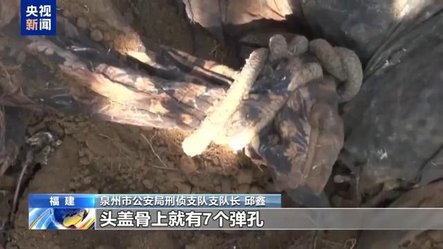 福建省泉州市公安局刑侦支队支队长 邱鑫:我们挖掘这副尸骨原始的惨状,可以想象出当时陈大卫的残暴程度。这具尸骨是跪姿头朝下,浑身都有铁链和粗绳捆绑,头盖骨上有7个弹孔,浑身从着装到骨骼上都有被开枪射击的痕迹。按照陈大卫的供述,是给民兵下令让他跪在坑里,打光所有的子弹以后,才对死者进行掩埋。
