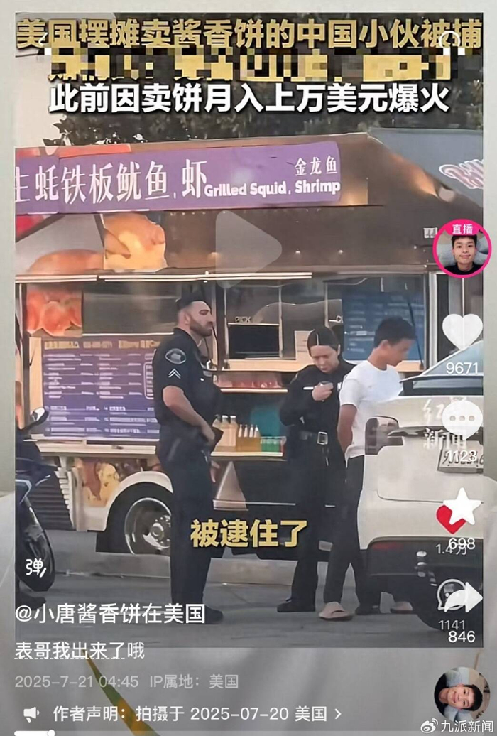 近日,在美国卖酱香饼月入十万的摊主小唐(化名)被警察带走,网传其涉嫌非法滞留、骚扰威胁、税务问题、教唆非法越境等等问题,也有网友称其是骚扰另一名女摊主。