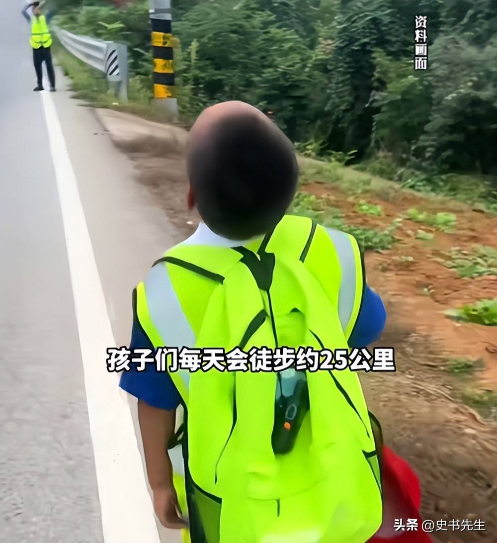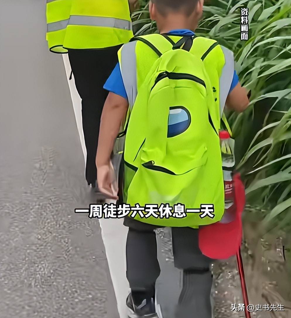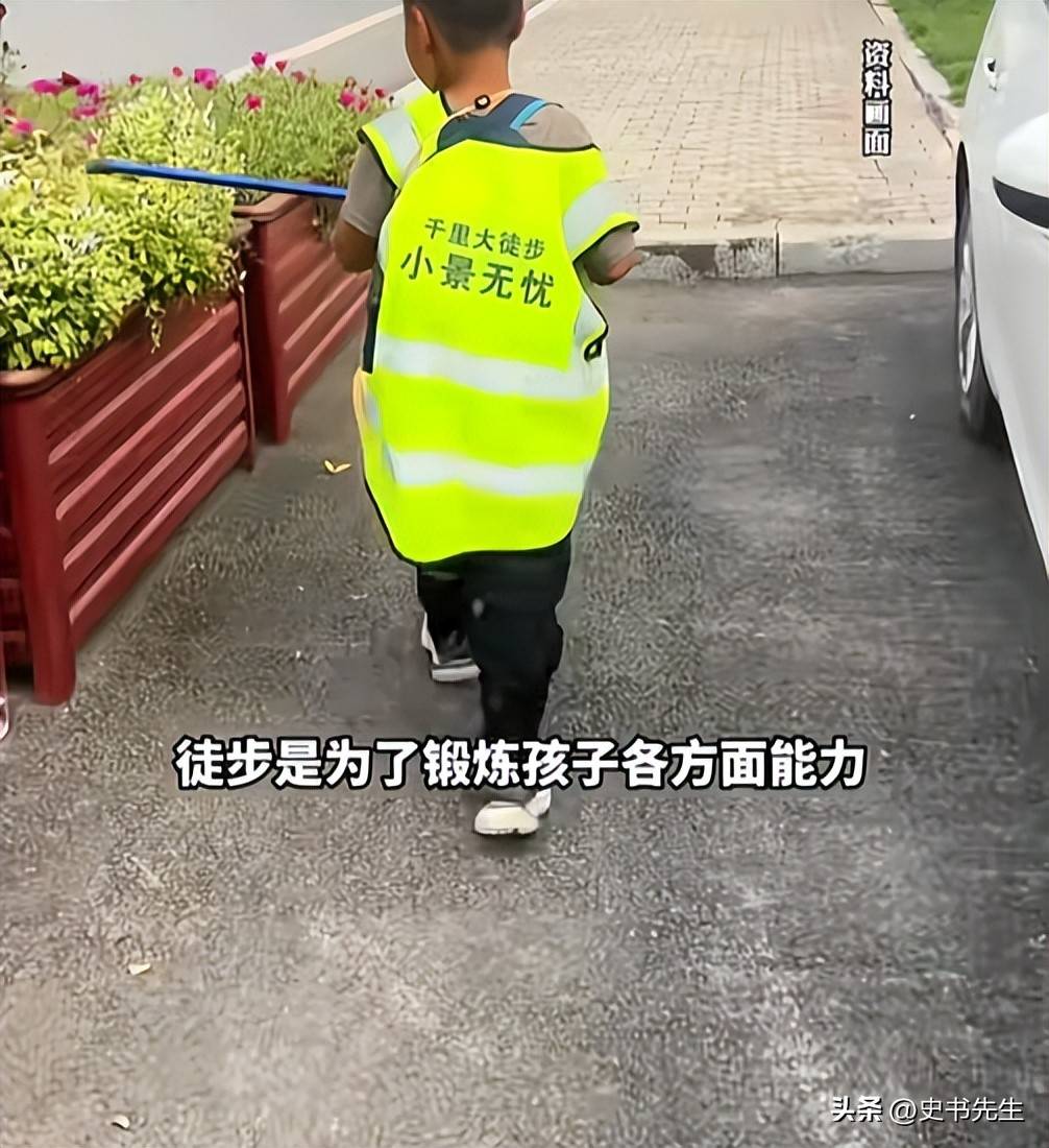 还给儿子穿上了亮眼的马甲,马甲的背上还写着“千里大徒步,小景无忧”,这可能也是父亲对孩子最真诚又最质朴的期待了,毕竟哪个父母不愿意孩子一生无忧呢?