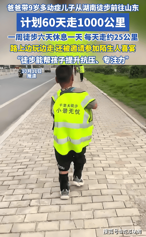 2025年10月1日,湖南慈利县,湖北籍父亲余先生牵着9岁的儿子小景踏上徒步征程,目标是从湖南徒步至山东聊城,全程超1000公里,计划60天完成。儿子小景幼年被诊断患有“注意缺陷多动障碍”(俗称多动症),存在学习困难、情绪波动、身体协调性差等问题。余先生为此辞去深圳工作全职照顾孩子,今年3月更申请休学一年,决心通过徒步这一特殊方式帮助儿子重建身心平衡。
