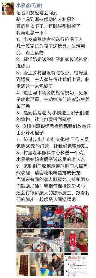 一路走来,余先生一行收获了很多温暖,同时,小景也学会了传递温暖。“在徒步的第9天,偶遇一个拾废品的老人,小景把零食送给了她。一路上,我们得到很多朋友的帮助,我们将这些爱心传递给更多需要帮助的人。”余先生说。